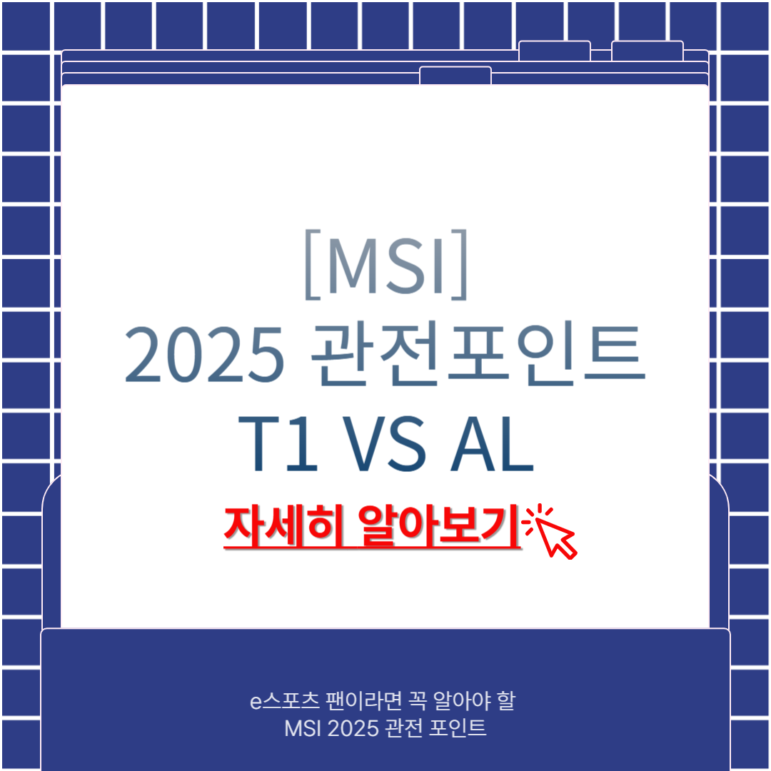 MSI 2025 하이라이트보기2025년 MSI(Mid-Season Invitational)는 리그오브레전드 팬들에게 또 하나의 흥미로운 국제 대회로 주목받고 있습니다. 특히 T1과 Anyones Legend(AL)의 맞대결은 많은 e스포츠 팬들의 관심을 집중시키고 있습니다. 본 글에서는 MSI 2025의 핵심 일정, 주요 팀 비교, 경기 관전 포인트를 상세하게 분석하여 e스포츠 팬이라면 반드시 알아야 할 정보를 제공합니다.※ 본 글은 인터넷 자료 검색과 언론을 통해 작성된 정보입니다. 최신 정보는 정부 공식 사이트의 정보를 확인해 주시길 바랍니다.📚 목차MSI 2025란 무엇인가?주요 팀 비교: T1 vs Anyones LegendMSI 2025 일정 및 대진표관전 포인트 요약결론: 팬이라면 놓치지 말..